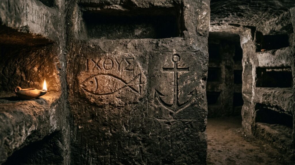 Por esta razón, en el arte paleocristiano de las catacumbas, no encontramos representaciones directas de la crucifixión. Los primeros seguidores de Jesús preferían símbolos velados o indirectos para identificarse entre sí y para expresar su fe sin atraer el escarnio o la persecución inmediata.