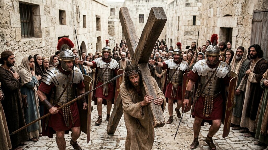 El condenado normalmente no cargaba la cruz completa (que podía pesar más de 100 kilos), sino solo el travesaño horizontal o patibulum. El poste vertical (stipes) solía estar ya fijado en el lugar de la ejecución. El hecho de que Jesús fuera obligado a cargar con su cruz —como meditamos en la segunda estación del Vía Crucis— añade una capa de agotamiento físico extremo a su ya debilitado estado tras la flagelación.