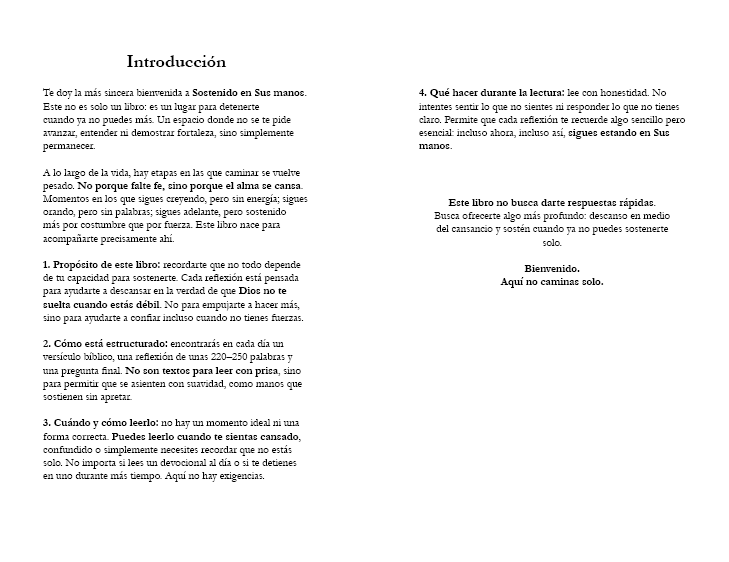 Sostenido en Sus Manos puede ser el descanso que tu alma anhela cuando las fuerzas ya no alcanzan. Cada reflexión es un recordatorio de que no tienes que sostenerlo todo a solas, de que hay unas manos firmes que te cuidan con ternura. Déjate abrazar por estas páginas y descubre que, cuando permites que Dios te sostenga, tu vida encuentra el alivio, la fortaleza y el refugio que solo Su amor puede dar.