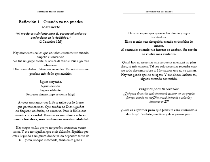 «Cuando ya no puedes más, sigues estando en Sus manos. No necesitas respuestas, solo permitirte ser sostenido por Quien nunca se cansa de cuidarte.»