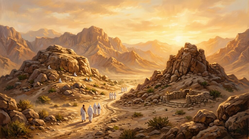 El episodio más dramático y significativo de Hajar en el desierto es su búsqueda desesperada de agua para Ismail. Ella corrió siete veces entre las colinas de Safa y Marwa, buscando alguna señal de vida o de auxilio. Este acto de amor maternal y perseverancia es tan sagrado que hoy forma parte del Hajj (la peregrinación a La Meca). Cada año, millones de musulmanes recrean los pasos de Hajar en un rito llamado Sa’i.