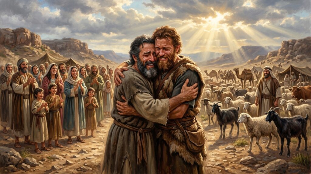 Esta escena es un testimonio del poder restaurador de Dios. El corazón de Esaú, que una vez estuvo lleno de odio asesino, fue suavizado. Esaú mostró una generosidad sorprendente, rechazando inicialmente los regalos de Jacob. Aunque sus caminos se separarían nuevamente —Jacob hacia Canaán y Esaú hacia Seir—, la tensión que definió sus vidas se resolvió en un momento de gracia humana.