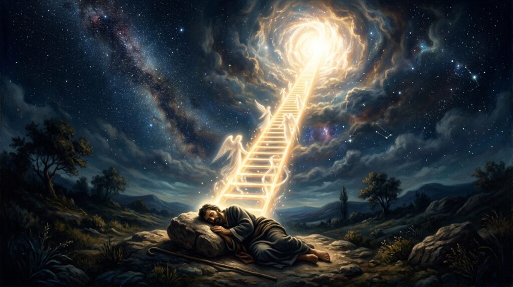 En su primera noche como fugitivo, Jacob se detuvo en un lugar que marcaría su vida para siempre. Usando una piedra como almohada, tuvo una visión: una escalera (o rampa) que unía la tierra con el cielo, con ángeles que subían y bajaban, y al Señor en lo alto.