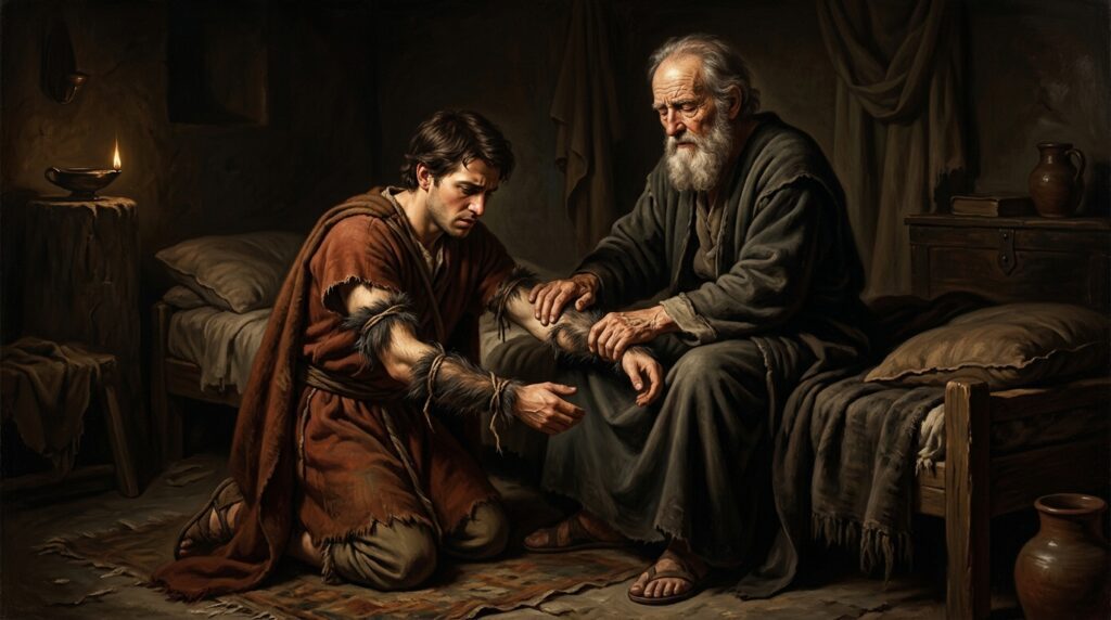 El conflicto entre los hermanos alcanzó su punto crítico cuando Isaac, ya anciano y con la vista nublada por las cataratas o la vejez, decidió que era hora de transmitir la bendición patriarcal. Este no era un simple testamento; en la mentalidad semítica, la bendición era una palabra «activa» que, una vez pronunciada, no podía ser revocada.