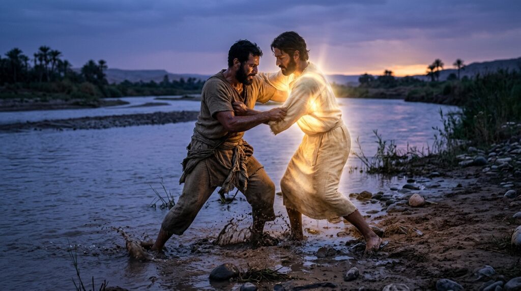 El luchador misterioso, que luego se revela como una manifestación de Dios (o un ángel del Señor), tocó el encaje del muslo de Jacob, descoyuntándolo. Jacob, aunque herido y debilitado físicamente, se negó a soltarlo: «No te dejaré, si no me bendices».