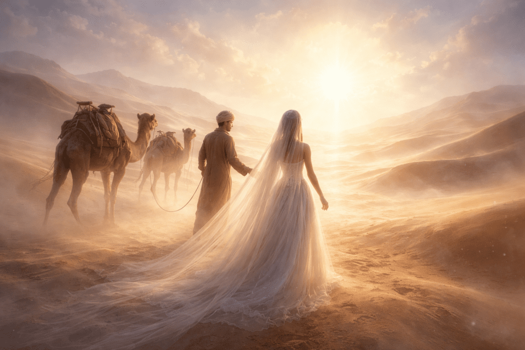 Tras el consentimiento de Rebeca, comienza un largo viaje de regreso. Este tránsito por el desierto representa la era actual de la Iglesia: un tiempo de peregrinaje donde la Esposa es conducida por el Espíritu Santo a través de un mundo hostil, fortalecida por las promesas de lo que verá al final del camino.