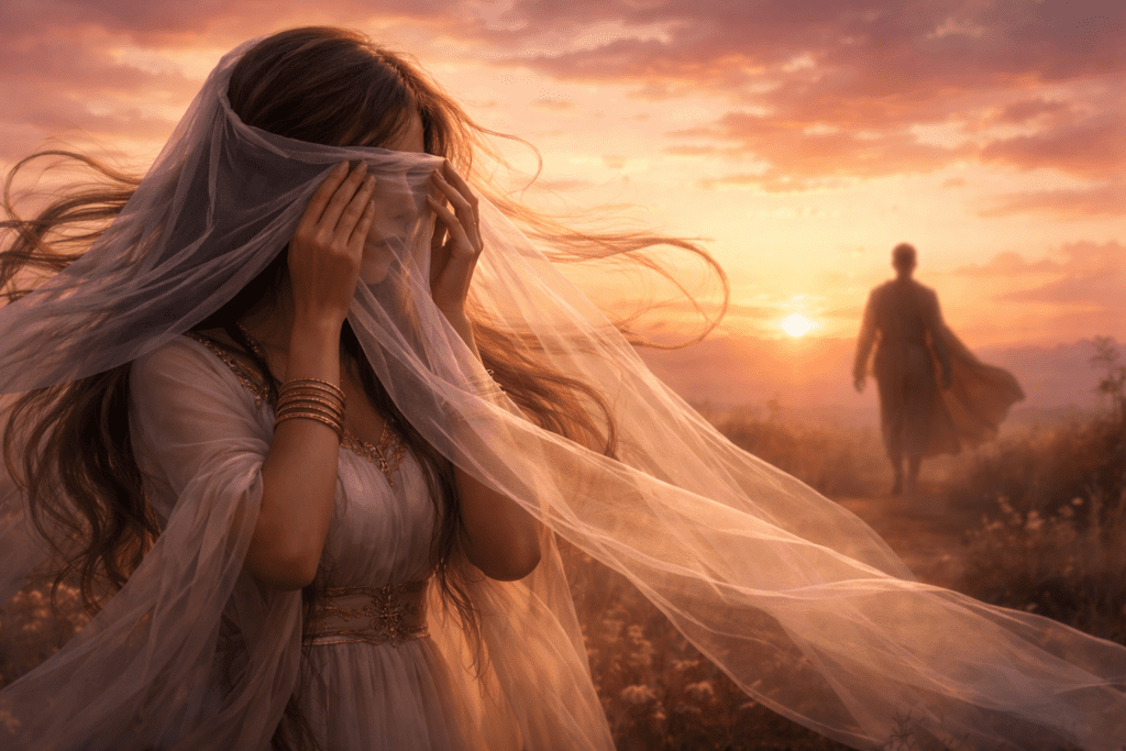 Cuando Rebeca ve a Isaac, se baja del camello y se cubre con un velo. Este acto de modestia y reverencia simboliza la santidad de la Iglesia ante su Señor. El velo representa que, hasta ese momento, la relación ha sido de fe, pero al encontrarse cara a cara, comienza una nueva etapa de conocimiento pleno. Isaac la introduce en la tienda de su madre Sara, un detalle que teológicamente sugiere la legitimación de la Iglesia como la verdadera heredera de las promesas de la madre de la fe, consolidando el consuelo y la alegría tras un periodo de espera.
