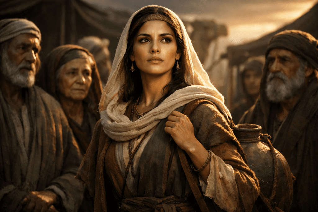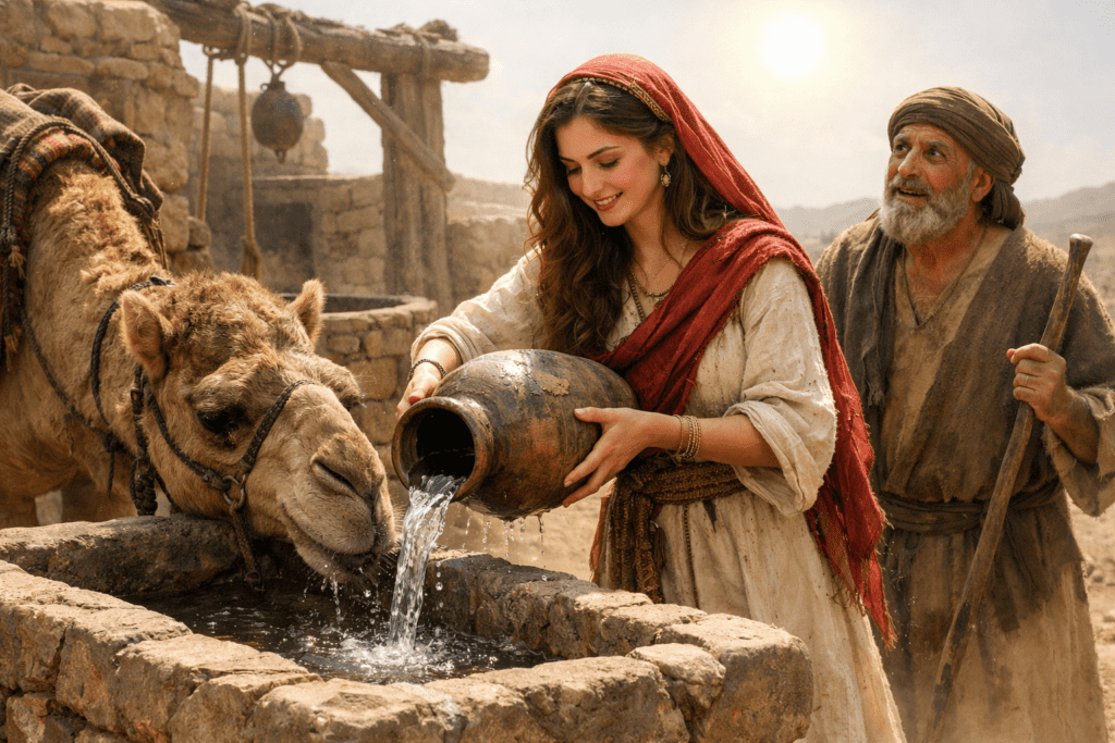 El escenario se traslada a la ciudad de Nacor. El pozo de agua, en la simbología bíblica, es a menudo el lugar de los encuentros que cambian el destino (pensemos en Jacob y Raquel, o Jesús y la mujer samaritana). Es el lugar de la provisión y de la vida en medio del desierto.